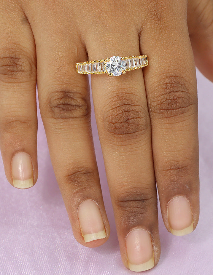 Shine like the star you are! The Solitaire Ring features a brilliant round-cut stone on a sleek band with delicate side accents — pure sparkle, pure elegance.