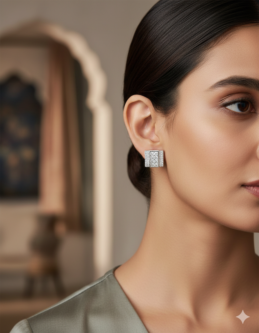 Complete your night event saree look with our dazzling rhodhium polish Studs. The sparkling American diamonds and White Stones will leave your peers stunned.