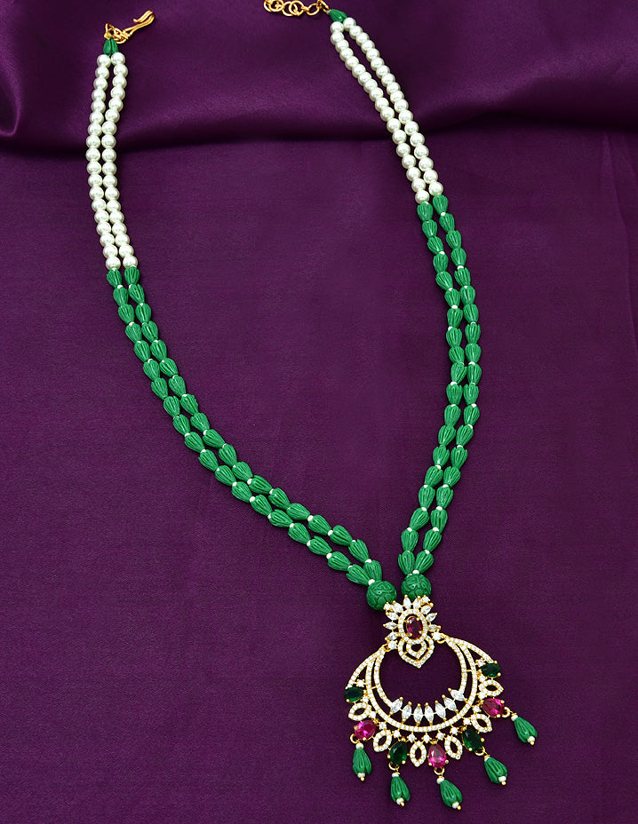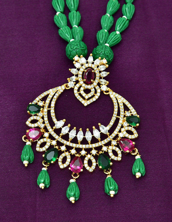 Shine bright with this Designer Zirconia Tulips Pendant, featuring gold polish, ruby-emerald beads & white stones. A perfect pick to add elegance and glamour to any festive or formal look!