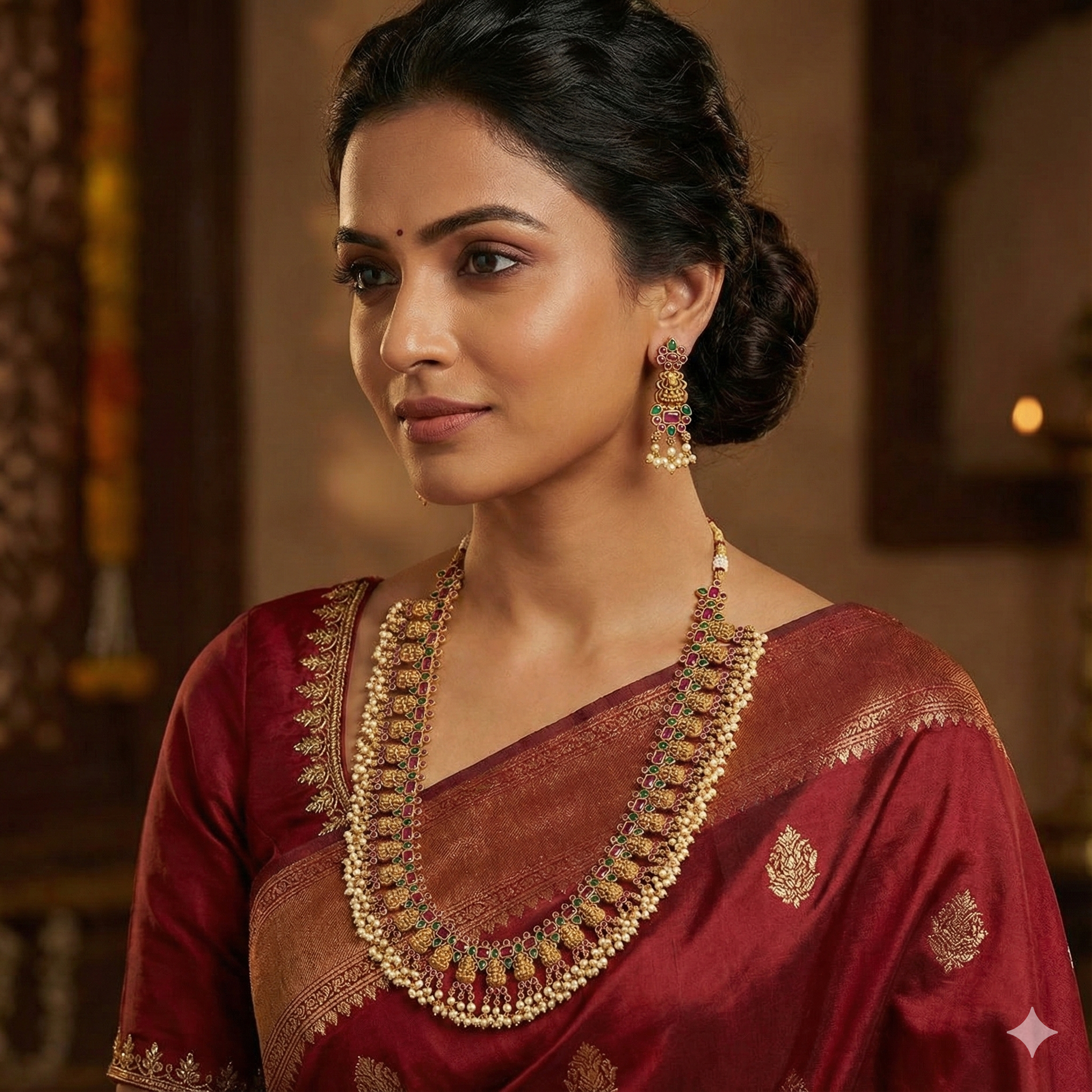 Elevate your look with this royal Guttapusalu Necklace Set, studded with emerald green stones and sparkling rubies. Perfect for weddings or festivals, it adds a rich, elegant touch to any outfit, balancing beauty and style effortlessly.