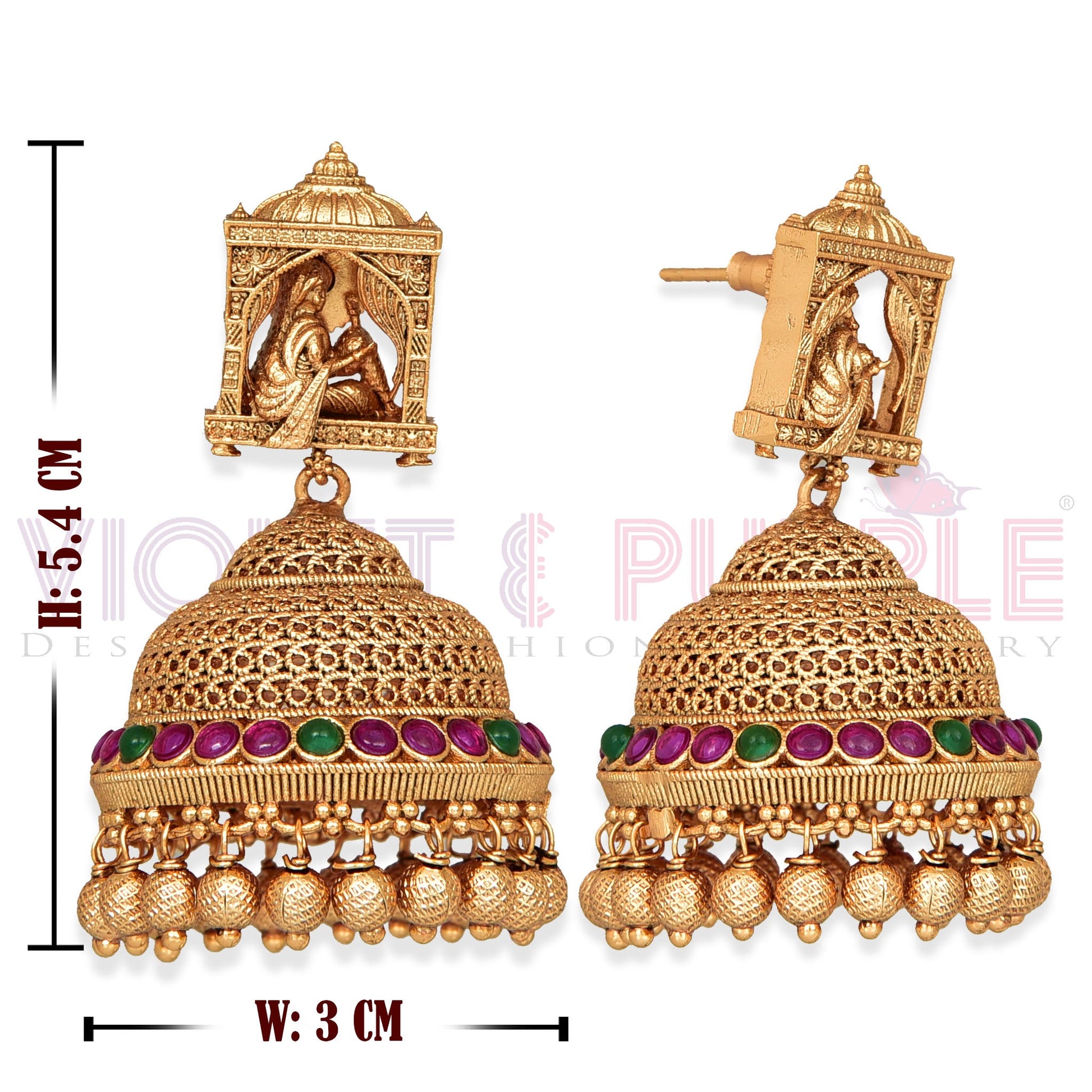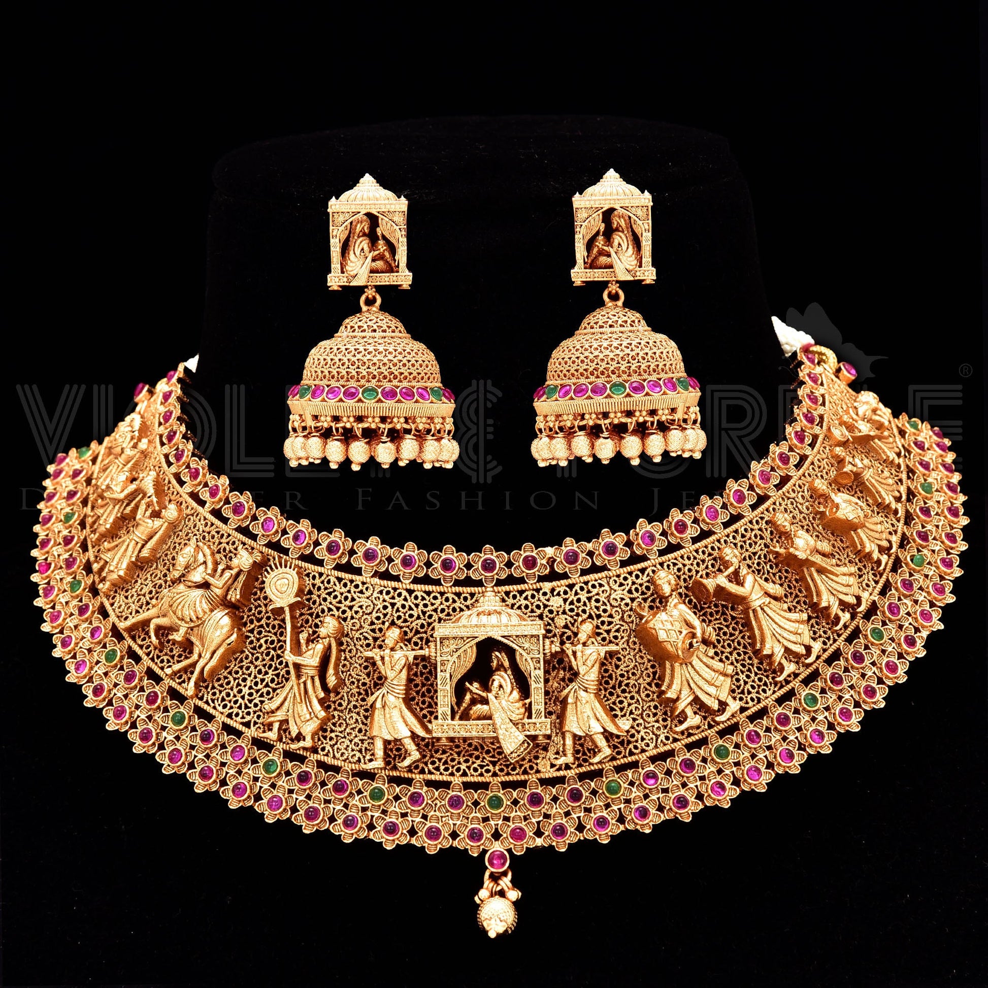 This beautiful Matt gold-plated Choker Set is made of the highest quality metalwork and embroidered with dazzling Ruby & Emerald Kempu Stones. Its perfect for any traditional occasion, and makes a bold style statement with its eye-catching desi looks.