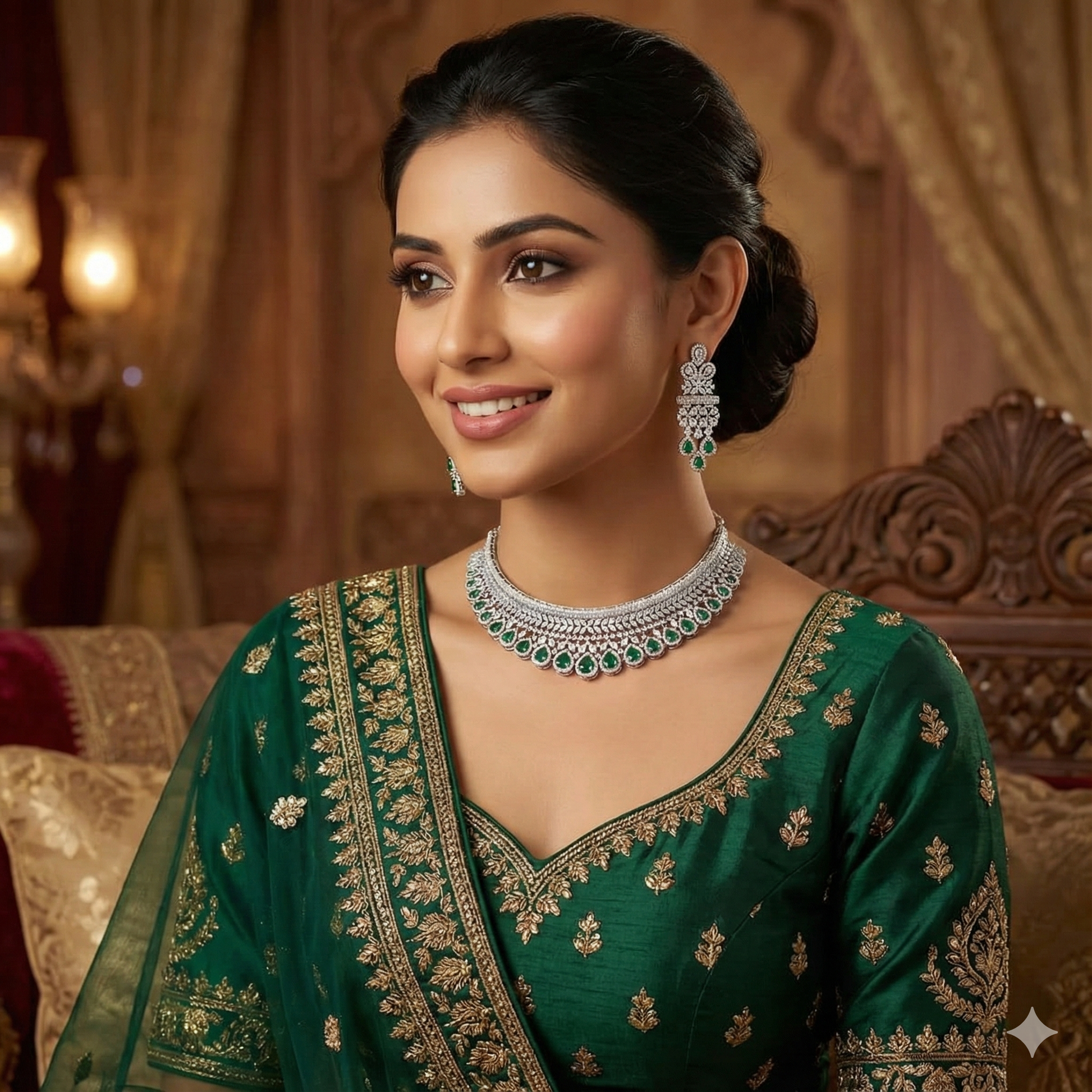 Slay like a princess with this enchanting Rhodium CZ Choker Set, featuring an auspicious design that exudes grandeur. The perfect choice for grand events and parties, its stunning combination of American diamonds and rhodium polish makes a bold, unforgettable statement.